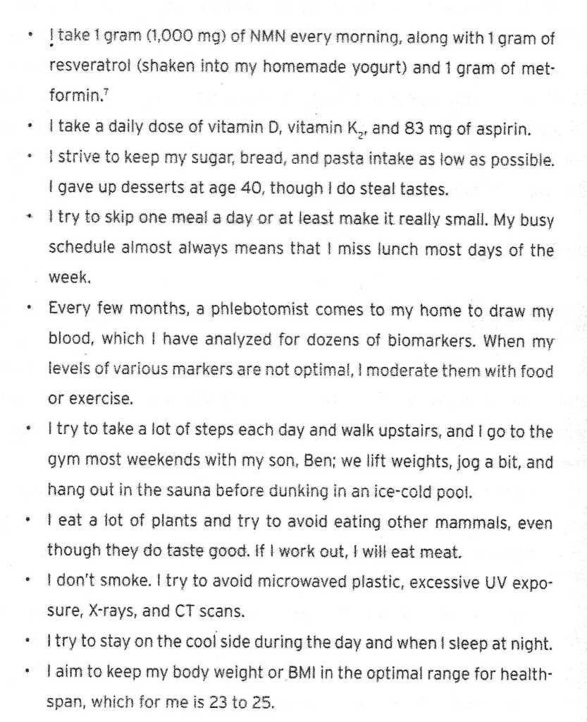So, what does David Sinclair do? Since he is on the cutting edge of longevity research, he is often asked this question – what does HE do to increase his own health and life span. Below is a copy of page 304, of Lifespan where he answers that question: